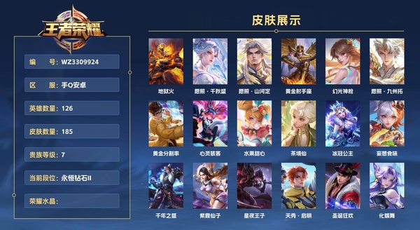 手Q安卓 126英雄 185皮肤 贵族等级7 地狱火 愿照·千秋盛 愿照·山河定 黄金射手座 幻光神枪 愿照·九州拓 黄金分割率 心灵骇客 水果甜心 茶境仙 冰冠公主 妄想食味 千年之狐 紫霞...