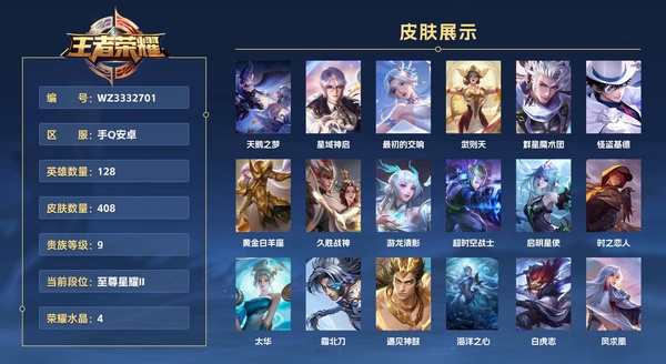 手Q安卓 128英雄 408皮肤 贵族等级9 已兑换荣耀水晶数4 天鹅之梦 星域神启 最初的交响 武则天 群星魔术团 怪盗基德 黄金白羊座 久胜战神 游龙清影 超时空战士 启明星使 时之恋人 ...