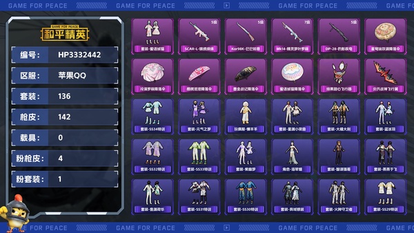 【区服】苹果QQ【等级】Lv.71【段位】超级王牌1星【历史总热力值】48468【时装总数】540【套装数量】136【红粉套装数量】1【枪械数量】142【红粉枪械数量】4【战备数量】129【装备...