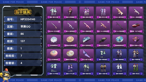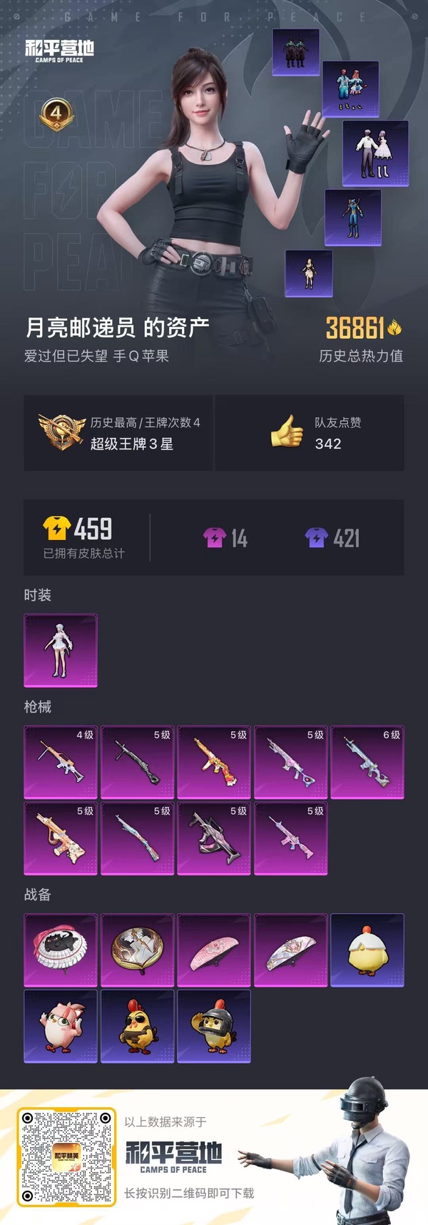 【区服】苹果QQ【等级】Lv.54【段位】坚韧铂金Ⅲ【历史总热力值】41617【时装总数】340【套装数量】86【红粉套装数量】4【枪械数量】137【红粉枪械数量】7【载具数量】1【战备数量】9...