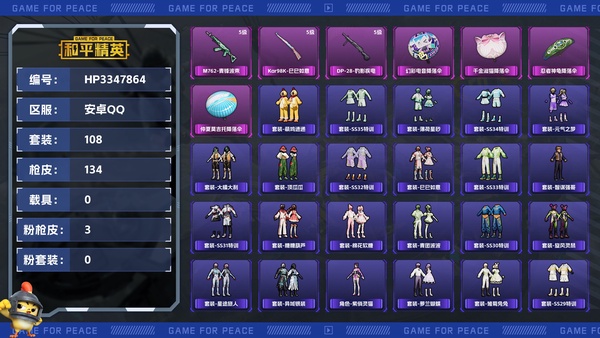 【区服】安卓QQ【等级】Lv.67【段位】超级王牌4星【历史总热力值】35618【时装总数】440【套装数量】108【枪械数量】134【红粉枪械数量】3【战备数量】96【装备数量】112【套装】...