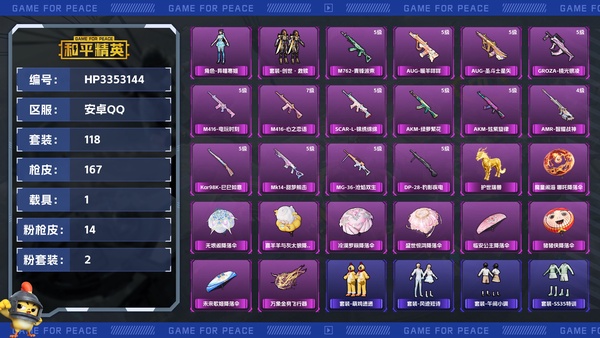【附带王者荣耀 至尊宝皮肤】区服】安卓微信【等级】Lv.59【段位】超级王牌【历史总热力值】43457【时装总数】465【套装数量】115【红粉套装数量】4【枪械数量】139【红粉枪械数量】