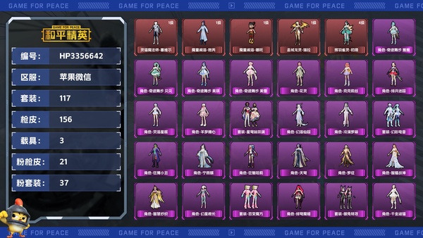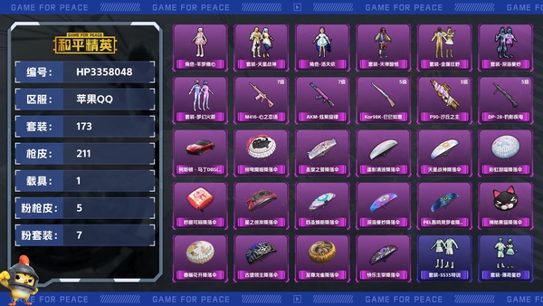 【区服】苹果QQ【等级】Lv.54【段位】坚韧铂金Ⅲ【历史总热力值】41617【时装总数】340【套装数量】86【红粉套装数量】4【枪械数量】137【红粉枪械数量】7【载具数量】1【战备数量】9...