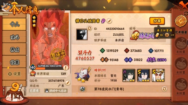 VIP9,648W战力,S忍10个,A忍21个,本服排名869,战区排名未上榜,通灵兽15个,7时装,上忍3阶,忍者星数303